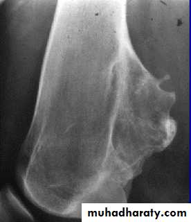 Starts as cartilaginous overgrowth at the edge of the epiphysis and grow outside the bone on the same direction (towards diaphysis), its base later on ossify and show on x-ray as an exostosis (either narrow base-pedanculated or wide base-sessile). Its growth continues with the bone and stops as the bone stops growing, any enlargement after that (especially if associated with pain) considered serious and regarded as malignant transformation until proved otherwise.