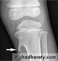 X-ray shows eccentrically located lucent small defect in the bone cortex, well defined surrounded by sclerosis.