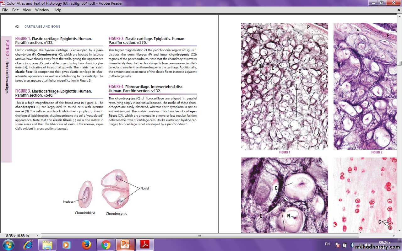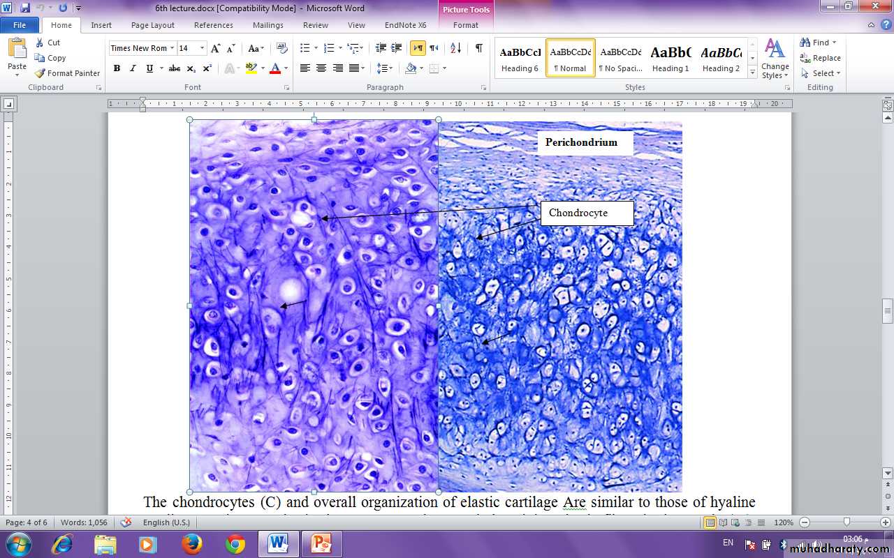 The chondrocytes and overall organization of elastic cartilage are similar to those of hyaline cartilage. Stains For elastin, however, reveal many dark-staining elastic fibers in the matrix (M), in addition to the major components found in hyaline matrix. elastic fibers provide greater flexibility to this form of cartilage. The section in the right includes perichondrium that is also similar to that of hyaline cartilage. (a) X160. Hematoxylin and orcein. (b) X100. Weigert resorcin-fuchsin.