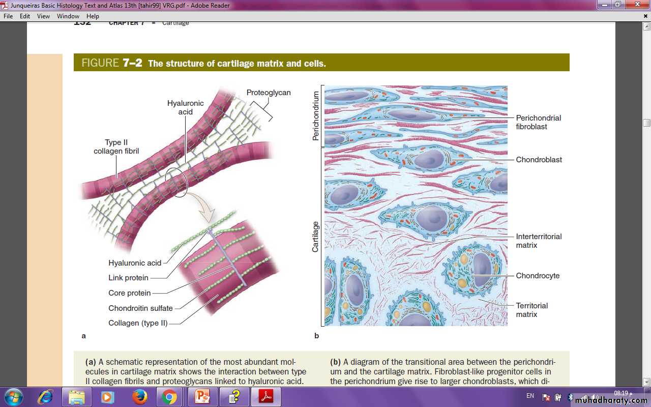 (b) A diagram of the transitional area between the perichondrium and the cartilage matrix. Fibroblast-like progenitor cells in the perichondrium give rise to larger chondroblasts, which divide and differentiate as chondrocytes. These functional cells produce matrix components and exist in lacunae embedded in the matrix. Staining differences are apparent between the matrix immediately around each lacuna, called the territorial matrix, and that more distant from lacunae, the interterritorial matrix. Collagen is more abundant in the interterritorial parts of the matrix.