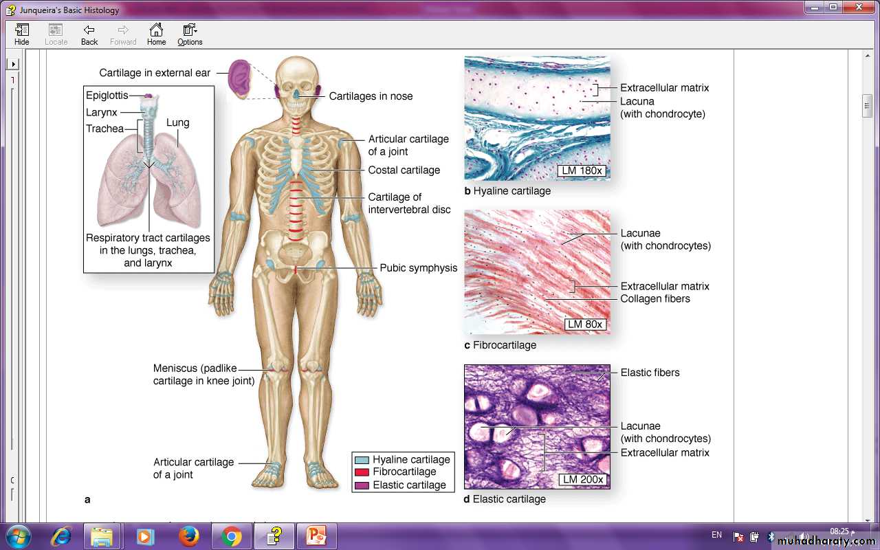 There are three types of adult cartilage distributed in many areas of the skeleton, based on the variations in the composition of matrix components and cells found in each type