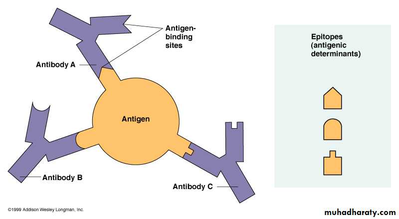 EPITOPE (= “antigenic determinant” ) - a site on the surface of an antigen molecule to which a single antibody molecule binds; generally an antigen has (and generally does) several or many different epitopes and reacts with many different antibodies.