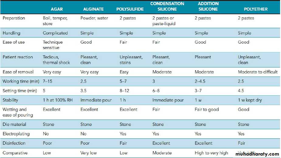 These materials have a long working time, good tear strength, good flow before setting, good reproduction of surface detail, high flexibility for easier removal around undercuts, and lower cost compared with silicones and polyethers.