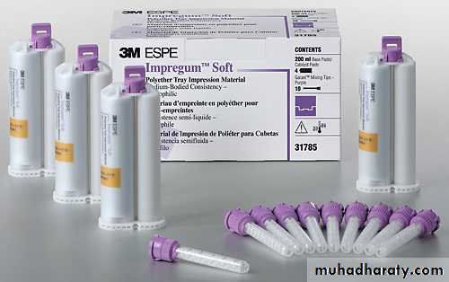Polyethers are available in low-, medium-, and high viscosity materials.Polyethers are similar to addition silicones that have a working time of 2.5 minutes and a setting time of 4.5 minutes.