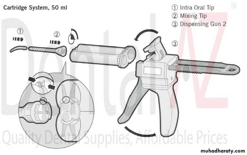 The set material does not adhere to set dental plaster or stone.These materials are usually mixed on a mixing pad with a spatula. Equal lengths of base and catalyst are extruded on the mixing pad.