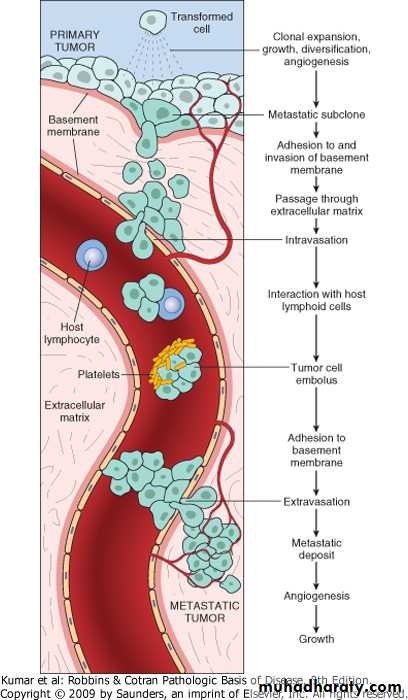 .vascular dissemination & homing of tumor cells -within circulation .tumor cells aggregate in clumps -homotypic adhesions among tumor cells -heterotypic adhesions between tumor cells & blood cells .tumor cells may bind & activate coagulation factors>emboli