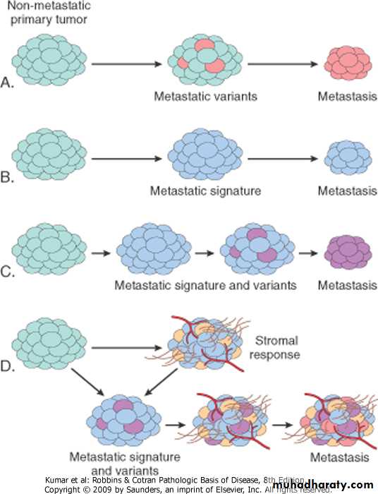 .theories explaining metastasis -clonal evolution model, tumor cell subclones acquire genetic alterations -metastatic signature .most tumor cells acquire abnormalities that allow them to metastasis -genetic variation (polymorphism), in human population -stem cell hypothesis, metastases require spread of tumor stem cells