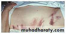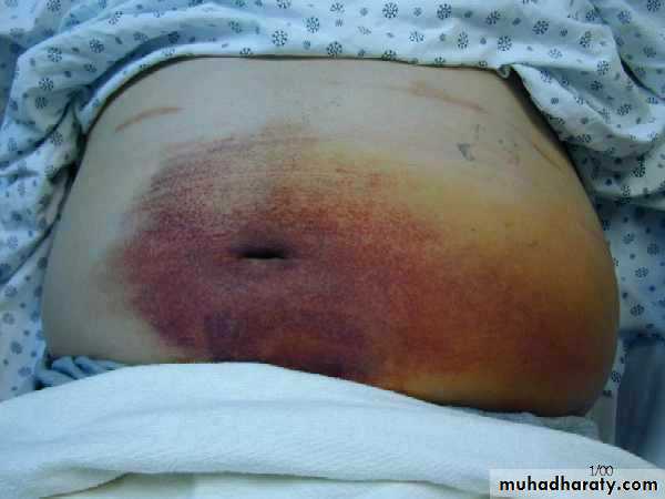 • Bluish ecchymosis discoloration of the skin may be visible after 2-3 days in the flanks (Grey Turner sign ), or around the umbilicus (Cullen’s sign).