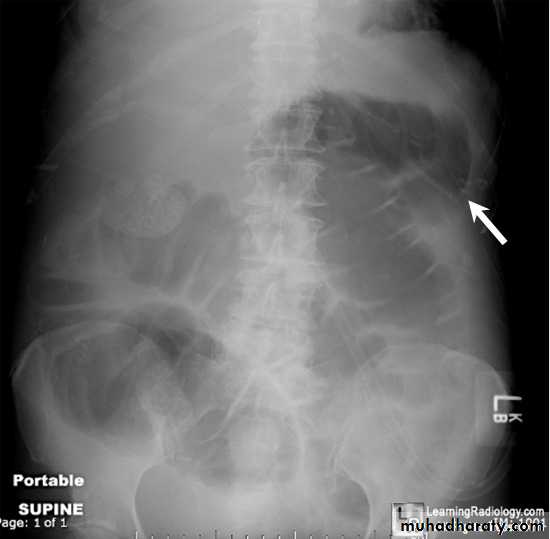 Colon cut off sign• A chest radiograph may show a pleural effusion, and a diffuse alveolar interstitial shadowing may suggest ARDS.