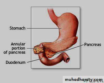 3. Annular pancreas = pancreatic head encircles the duodenum
