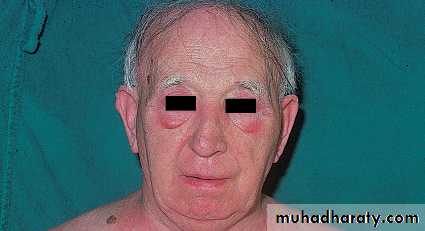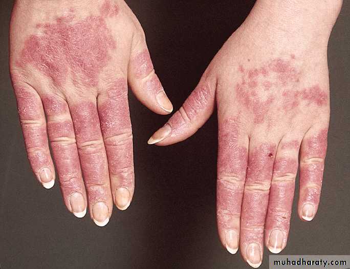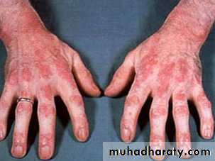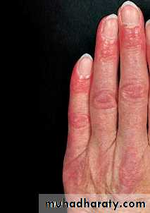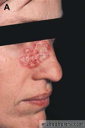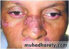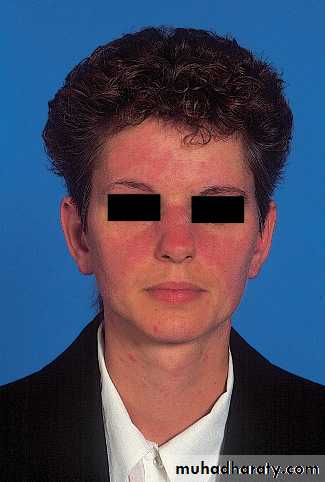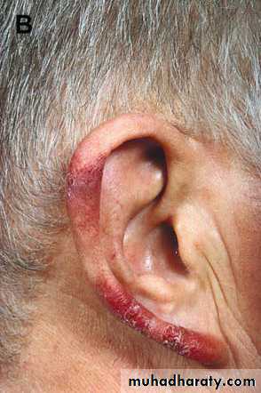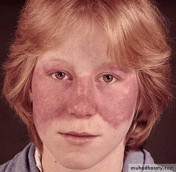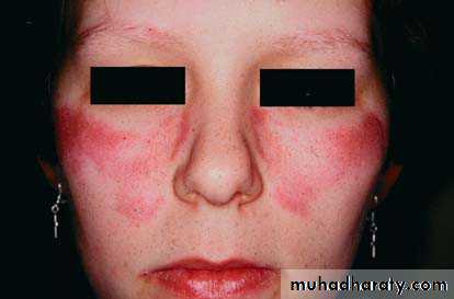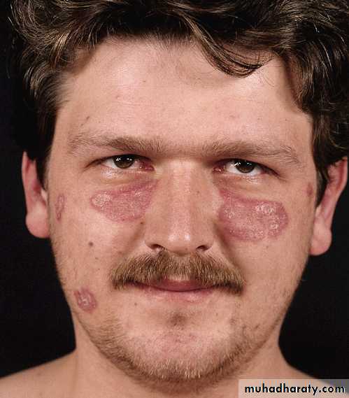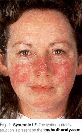 (20-30% of patients) is painful or pruritic erythematous plaques and occurs in a photosensitive distribution that involves the cheecks ,nasal bridge and spares the nasolabial folds.• Subacute cutaneous lupus erythematosus (SCLE):