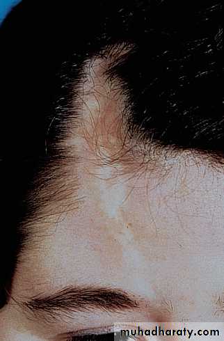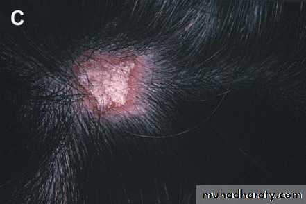 lesions are long-lasting for up to decades.discoid erythymatous scaly plaques with follicular plugging.