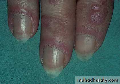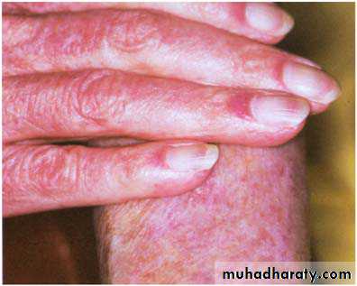 Examination of nail-fold capillary loops using a dermtoscope may show loss of the normal loop pattern and capillary 'fallout' with haemorrhage and dots.