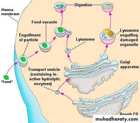 c- Autophagosomes: also called autophagic vacuoles or cytolysosomes. They contain some part of the cell in the process of digestion such as ER, mitochondria etc. digestion of these intracellular components is described as cellular autophagy.