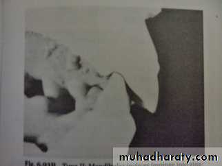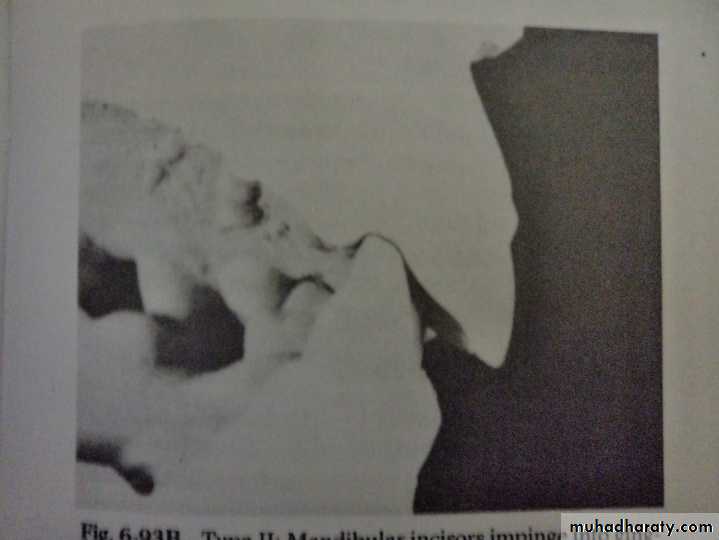 Type 1 – the mandibular incisors extrude and impinge into the palate.Type 2 – the mandibular incisors impinge into the gingival sulci of the maxillary incisors.