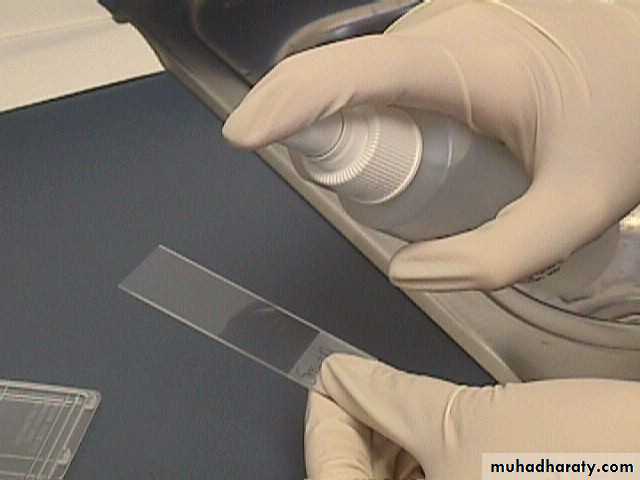 slide and applies a fixative. The slide is sent to a