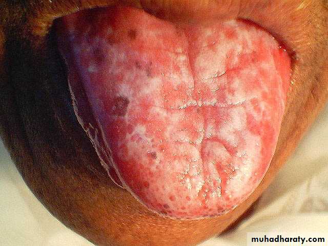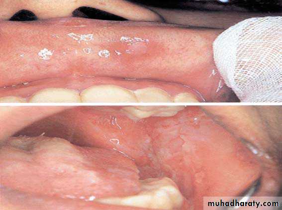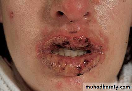 Diffuse ulceration, crusting of lips, tongue, buccal mucosa
