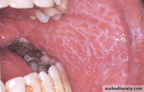 White lacy network lying on the buccal mucosa.