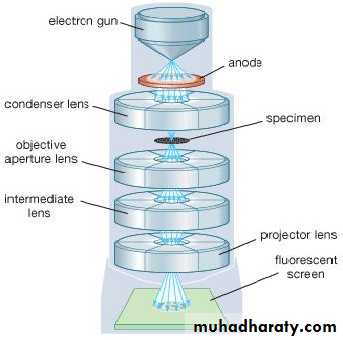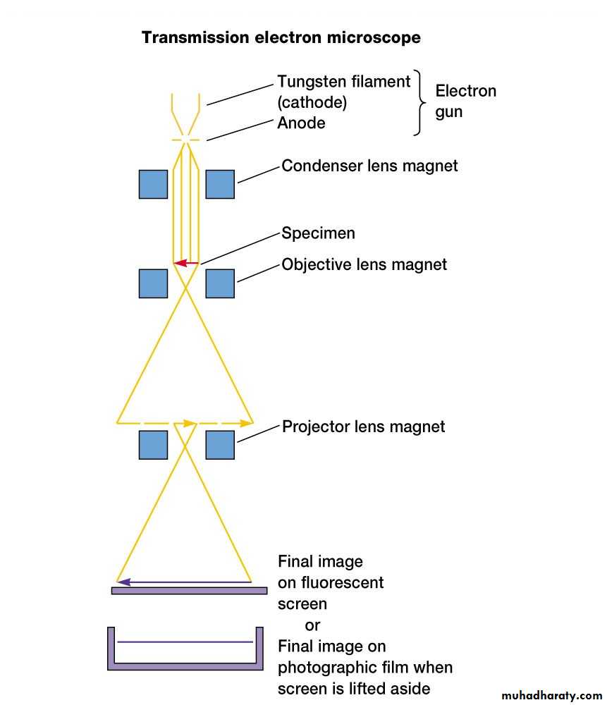 The electron beam is accelerated by an anode typically at +100 keV with respect to the cathode, focused by electrostatic and electromagnetic lenses, and transmitted through the specimen that is in part transparent to electrons and in part scatters them out of the beam