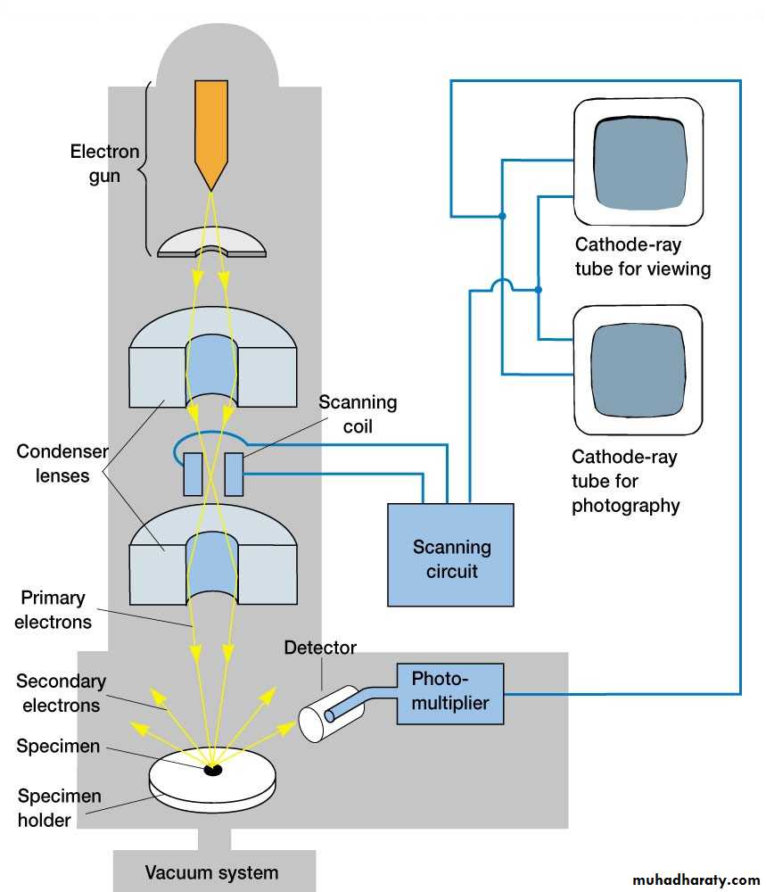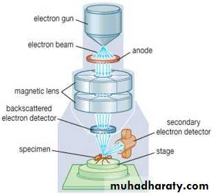2-Scanning Electron Microscope (SEM)Unlike the (TEM), where electrons of the high voltage beam carry the image of the specimen, the electron beam of the scanning electron microscope (SEM) does not at any time carry a complete image of the specimen.