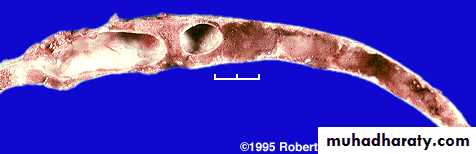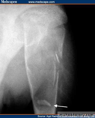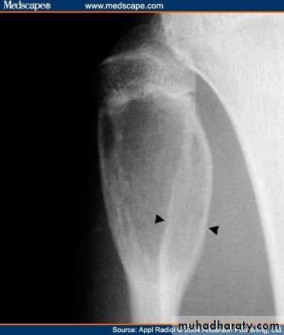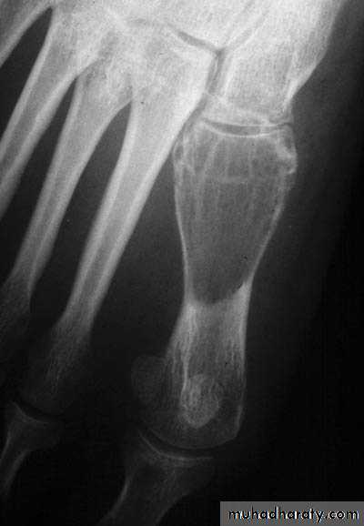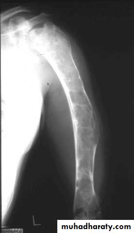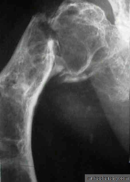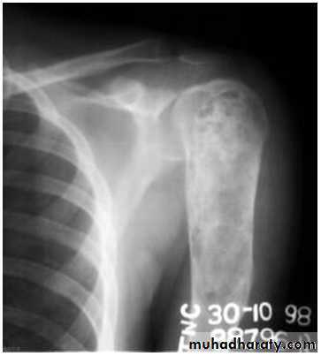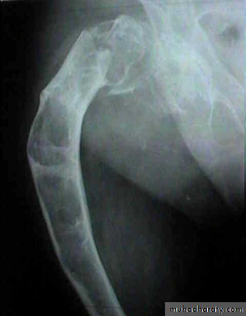 The lesion may be very large causes bone expansion and cortical thinning with progressive deformity and sometimes pathological fracture.Lesions occur in metaphysis & diaphysis, proximal femur is a common site it gives characteristic deformity called (shepherd’s-crock deformity(عصا الراعي.