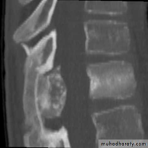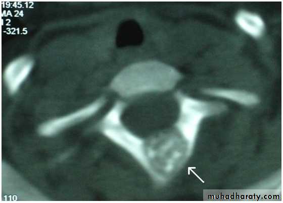 Its commoner in the spine and flat bones& usually presents as pain or muscle spasm.X-ray shows well-defined lytic lesion surrounded by thin zone of sclerosis, it may contain flecks of calcification.
