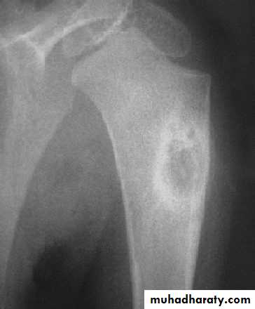 Presents as local pain or pathological fracture.Occurs in the metaphysis and directed towards diaphysis.