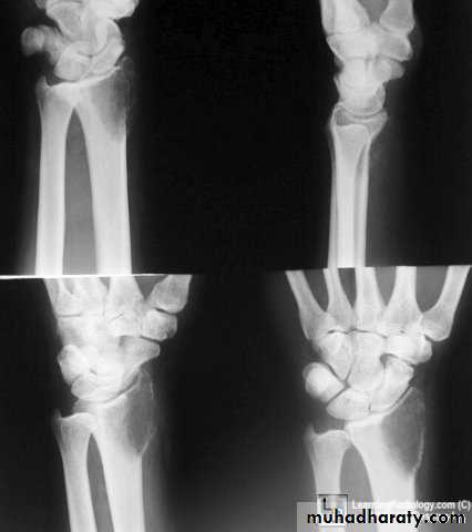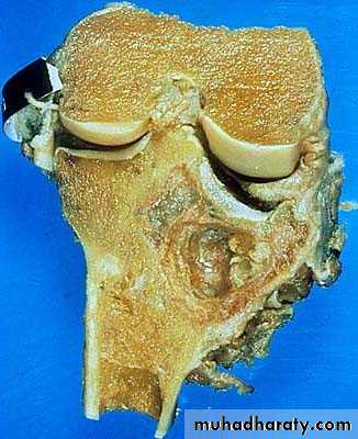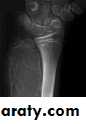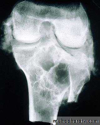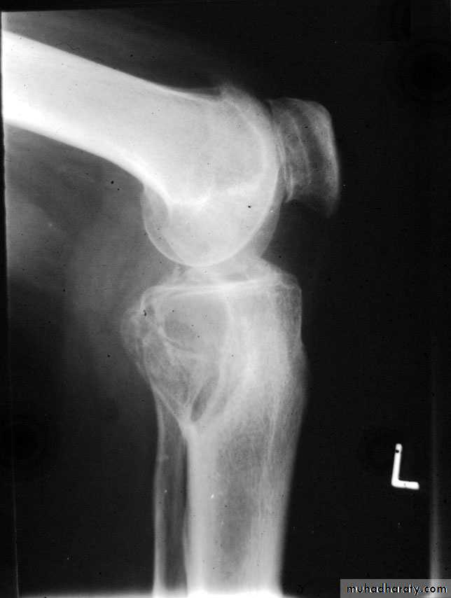 O/E vague swelling at the bone end and signs of joint irritation.X-ray: