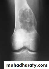 Rarefied area of the bone end reaching just below the articular surface.Eccentric lesion with bone expansion and ballooning with cortical thinning, sometimes pathological fracture.