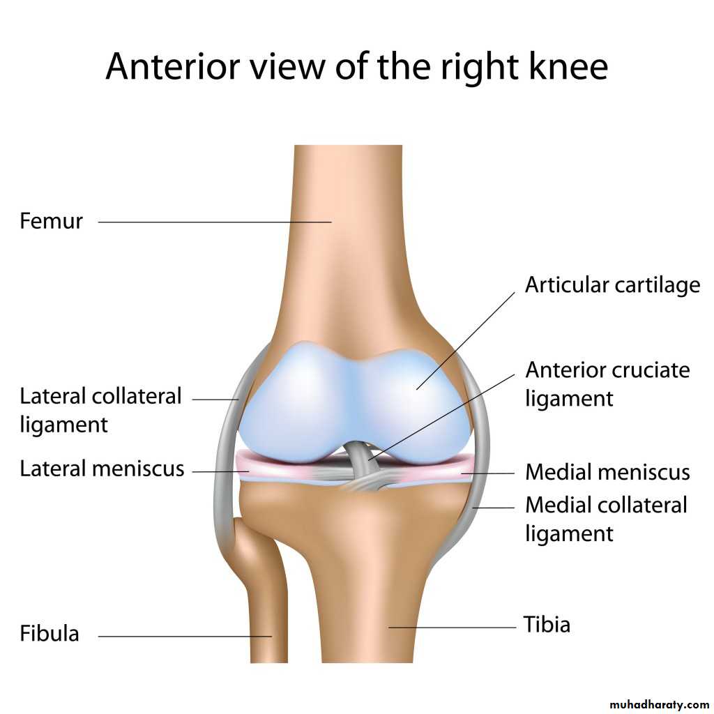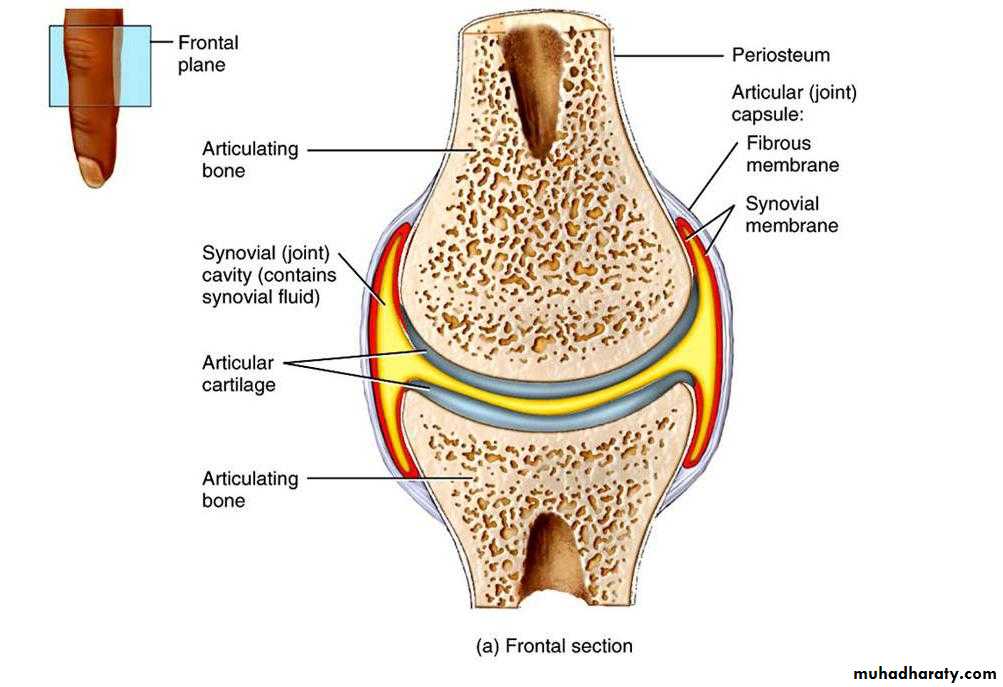 Dr. Taqey AlMosaweyA bone joint composed from synovial membrane in cased two bone ends and synovial fluids (fig.5) .the surfaces of the joint are articular cartilage . the surface of the cartilage is rough which plays an useful role in joint lubrication by trapping some of the synovial fluid . this fluid squeezed in the joint according to the stress applied on the joint .the amount and the viscosity of synovial fluid change according to the applied stress . when a continues stress applied on the knee joint , synovial fluid in continually squeezed in the joint which cause a swollen in the joint .