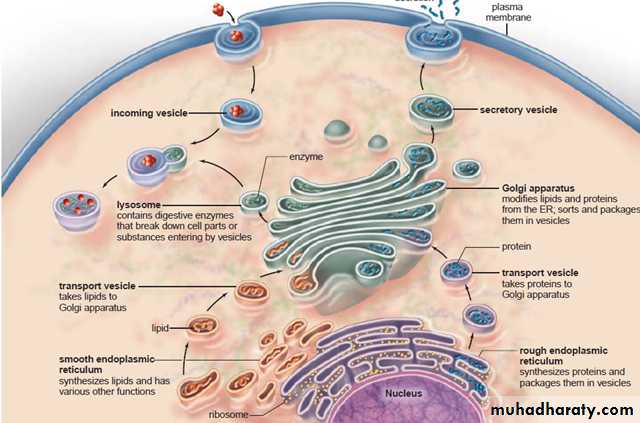 The endomembrane system consists of the nuclear envelope, the endoplasmic reticulum, the Golgi apparatus, lysosomes, and vesicles.