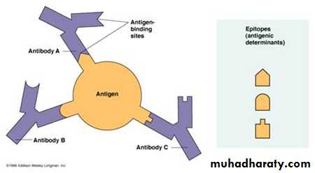 Each epitope is recognized by a different antibody and may interact with them by paratopes of Antibody