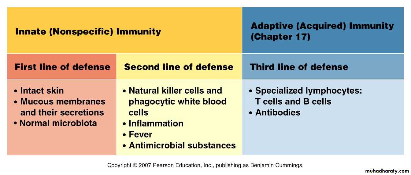 The Innate or Non-Specific Immune Response (present before birth also called natural or native immunity)The Adaptive or Specific Immune Response (developed by exposure to pathogens, or in a broader sense, antigens also called specific or acquired immunity)