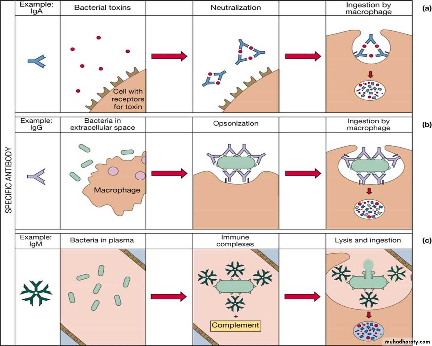 • neutralization of the antigen (e.g. soluble toxins, viruses)