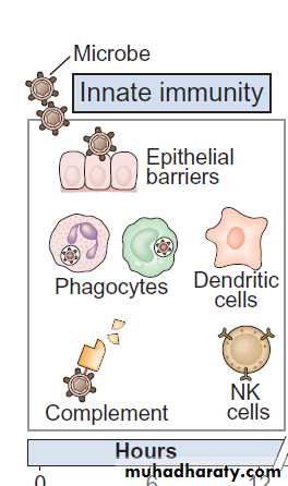 • specialized cells phagocytes, specialized lymphocytes called natural killer cells all of which function to block the entry of microbes and to rapidly eliminate microbes that do succeed in entering host tissues or circulation.