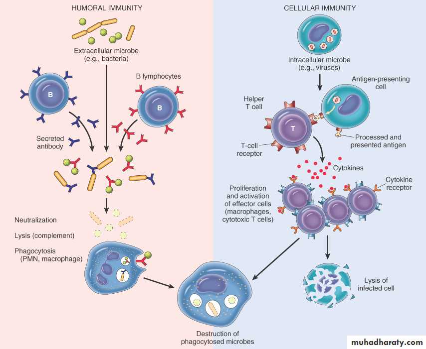 • B lymphocytes secrete antibodies that eliminate extracellular microbes.