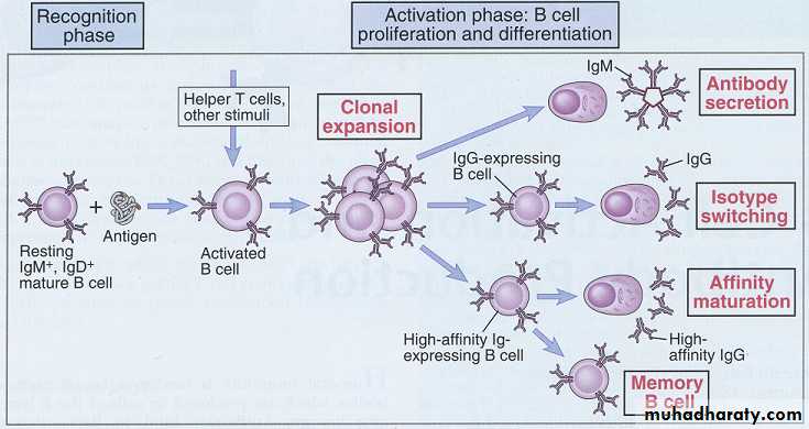 Recognition phase: resting mature B cells and Igs converted to activated cells after Ag invasionActivation phase: B cell proliferation(clonal expansion) and differentiation