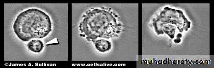 Here, a smaller Killer T Cell (arrow) is attacking and killing a much larger flu virus-infected target. The sequence represents 30 minutes elapsed time. NK cells play a major role in the rejection of tumors and cells infected by viruses. The cells kill by releasing small cytoplasmic granules of proteins called perforin and granzyme that cause the target cell to die by apoptosis.