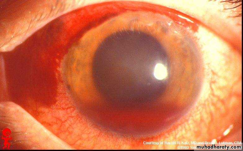 Hypopium (pus in the anterior chamber) with cloudy cornea +red eye