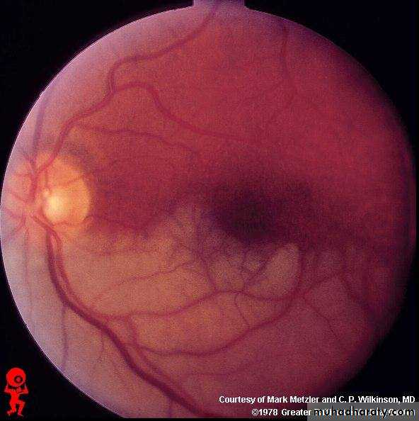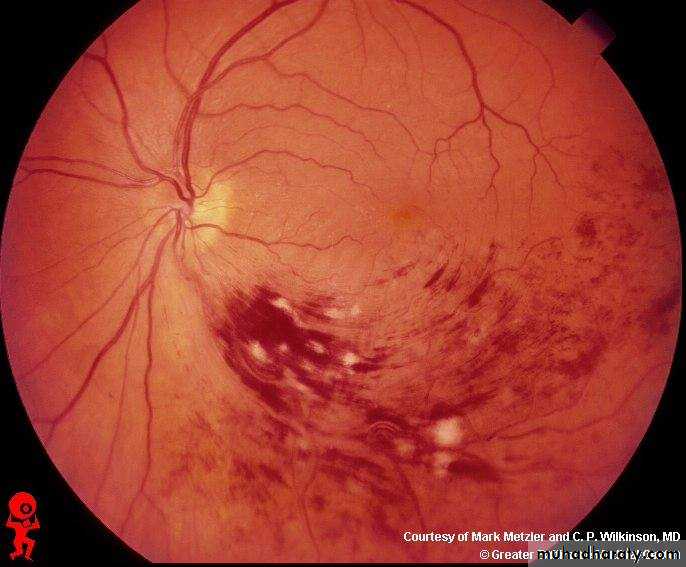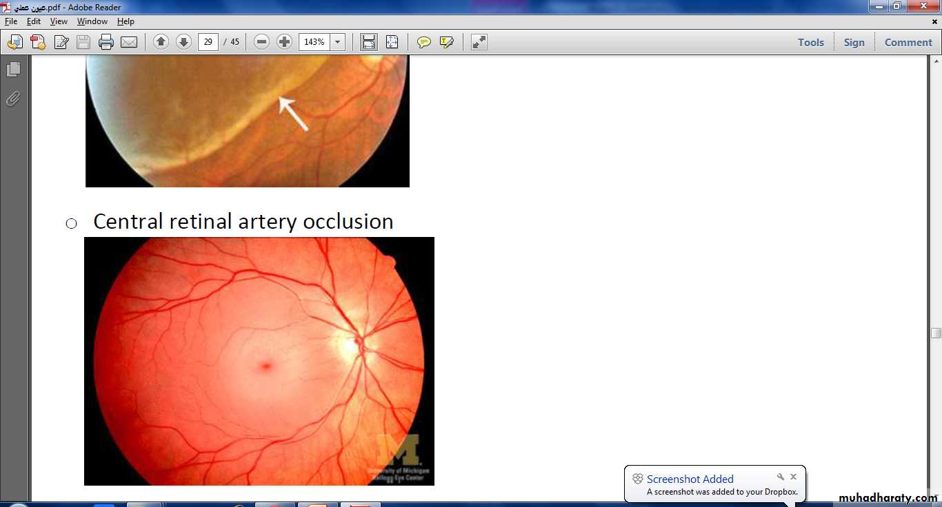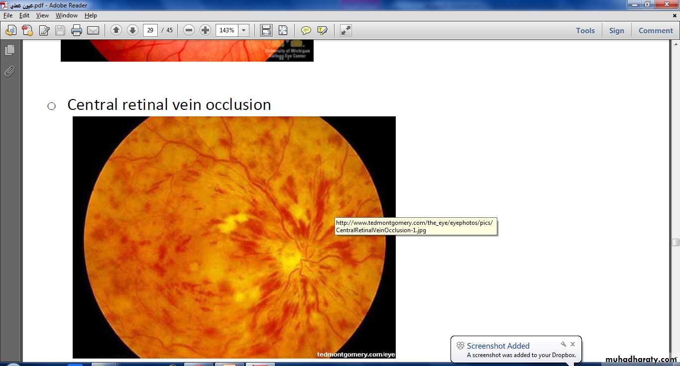 Tx :YAG laser capsulotomyOcclusion of the lower temporal branch of CRV marked by hemorrhage and multiple dots of ischemia in the lower temporal zone of retina