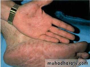 eruptions that at first are macules and inconspicuous, later papules and more obvious. Lesions are distributed symmetrically and are of a coppery ham colour.