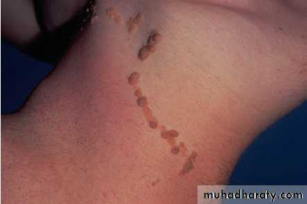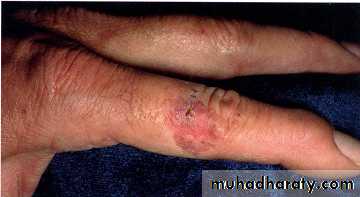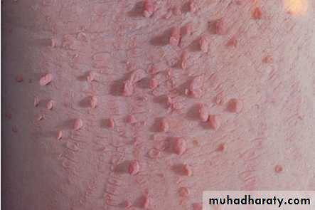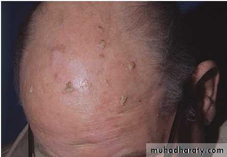 Actinic keratoses discrete rough-surfaced pink or grey scaling macules or papules usually less than 1 cm in diameter appear on sun-damaged skin, middle-aged and elderly.The effects of sun exposure are cumulative.