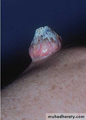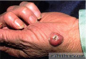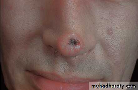 occur mainly on the exposed skin of fair individuals. More than two-thirds are on the face and most of the rest are on the arms.The lesion starts as a pink papule that rapidly enlarges. After 5 – 6 weeks the centre of the nodule forms either a keratinous plug or a crater.
