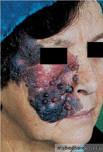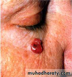 Basal cell carcinoma (rodent ulcer) most common, appear on faces of elderly. Prolonged sun exposure main factor. destroys tissue locally.Nodulo-ulcerative small glistening translucent, skin-coloured papule. Central necrosis leaves an ulcer with an adherent crust and a rolled pearly edge. Coarse telangiectatic vessels run across surface.