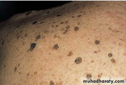 Seborrhoeic keratosisun-related to sebaceous glands. Usually arise after the age of 50 years. multiple but may be single. common on the face and trunk.