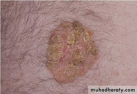 Bowen’s disease Usually single, these slowly expanding pink scaly plaques. Their border is sharply defined, with reniform projections and notches giving them an amoeboid shape.3% progress into squamous cell carcinoma.
