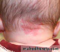Malformations1.Salmon patches (‘stork bites’) present in 50% of all babies, caused by dilatated capillaries in superficial dermis. dull red, often telangiectatic macules,on the nape of the neck, the forehead and the upper eyelids.