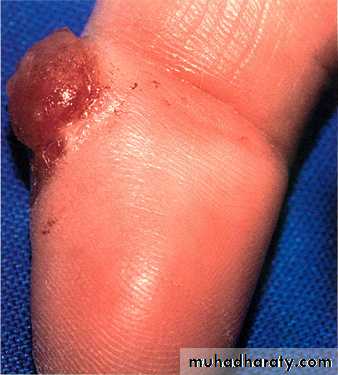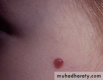 Pyogenic granulomas common benign acquired haemangiomas. develop at sites of trauma, over course of a few weeks, as bright red raised, raspberry-like lesions which bleed easily. removed by curettage under local anaesthetic with cautery to the base.