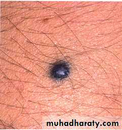Blue naevi striking grey–blue color, appear on the limbs, buttocks and lower back. usually solitary.