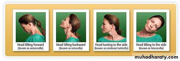 Cervical dystonia—dystonic contractions of neck muscles causing the head to deviate to one side (torticollis), in a forward direction (anterocollis), or in a backward direction (retrocollis).